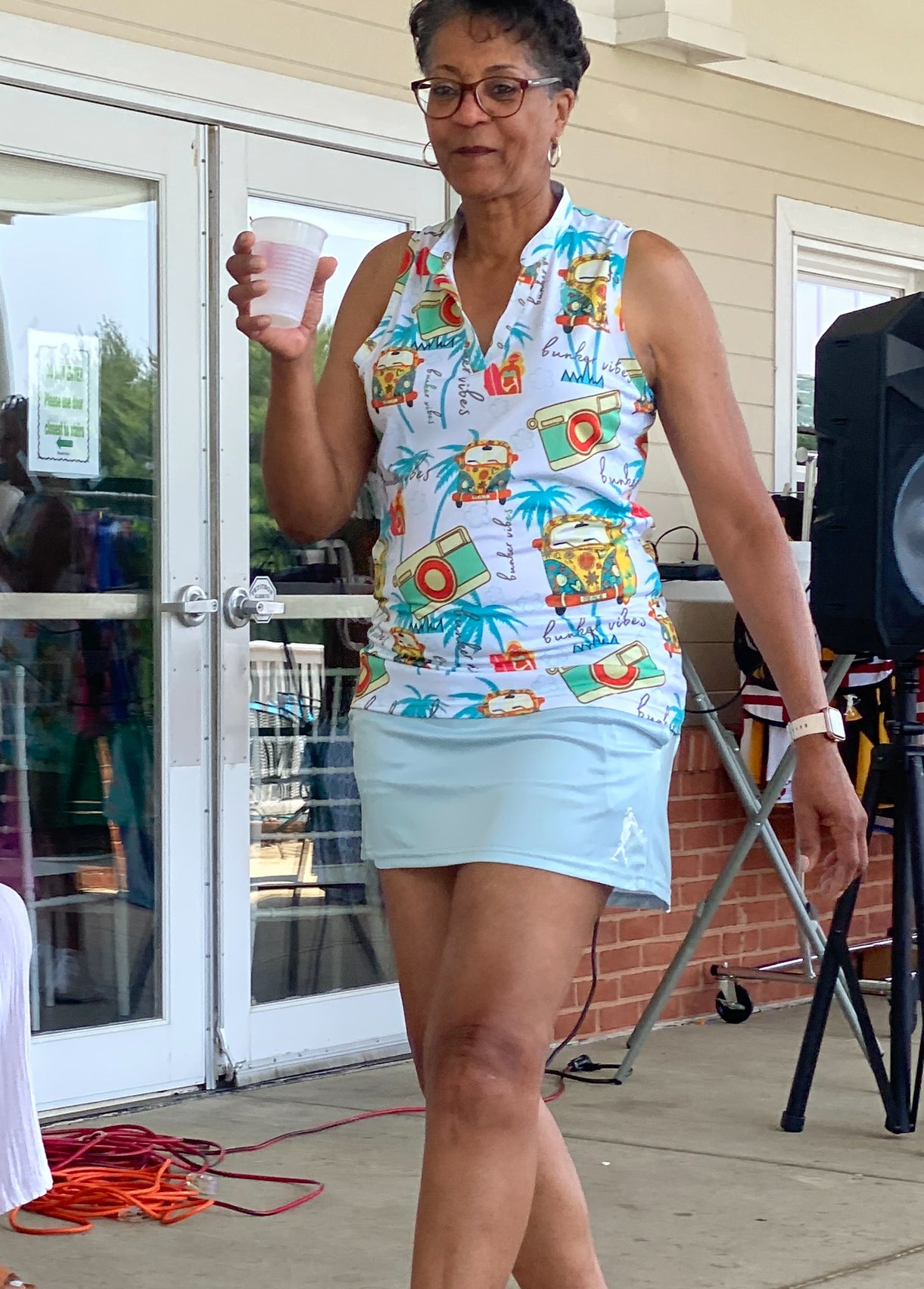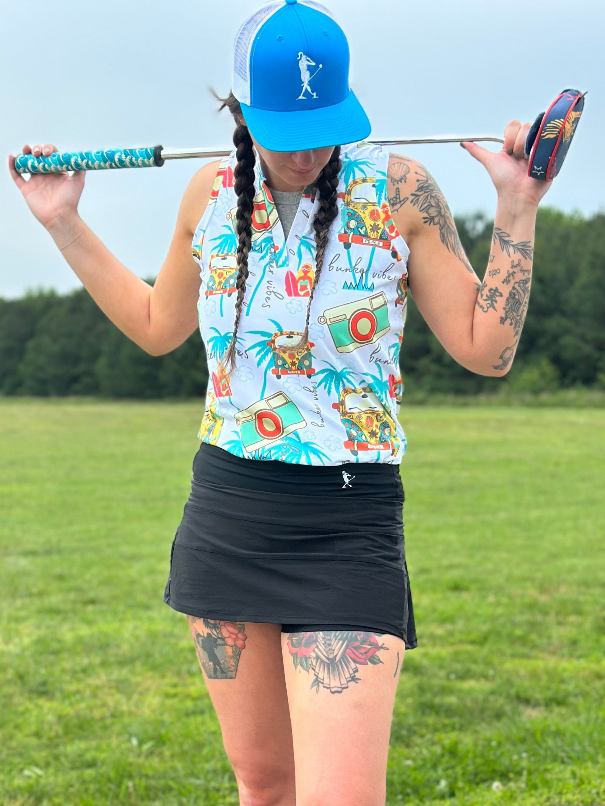 For the cool So-Cal gal who loves to golf, this breezy and buttonless polo features adorable VW bugs, cameras, and palm trees, all made with 92% Polyester and 8% Spandex. Perfect for staying fresh, dry, and wrinkle-free on the green with UPF 50+ protection and anti-odor, moisture-wicking materials that provide 4-way stretch.