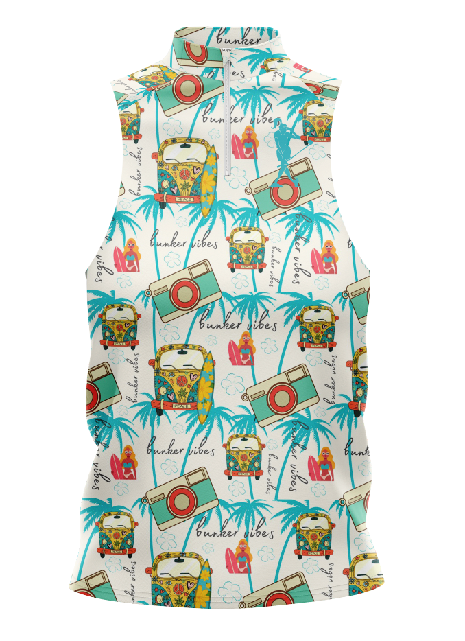 Enter the sunshine state of mind with this SoCal-inspired sleeveless polo! Featuring a zipper neckline and quirky graphics of a VW bug, palm trees, and camera, this polo is made with 92% Polyester and 8% Spandex for UPF 50+ protection and anti-odor, moisture-wicking, wrinkle-resistant, and 4-way stretch properties.