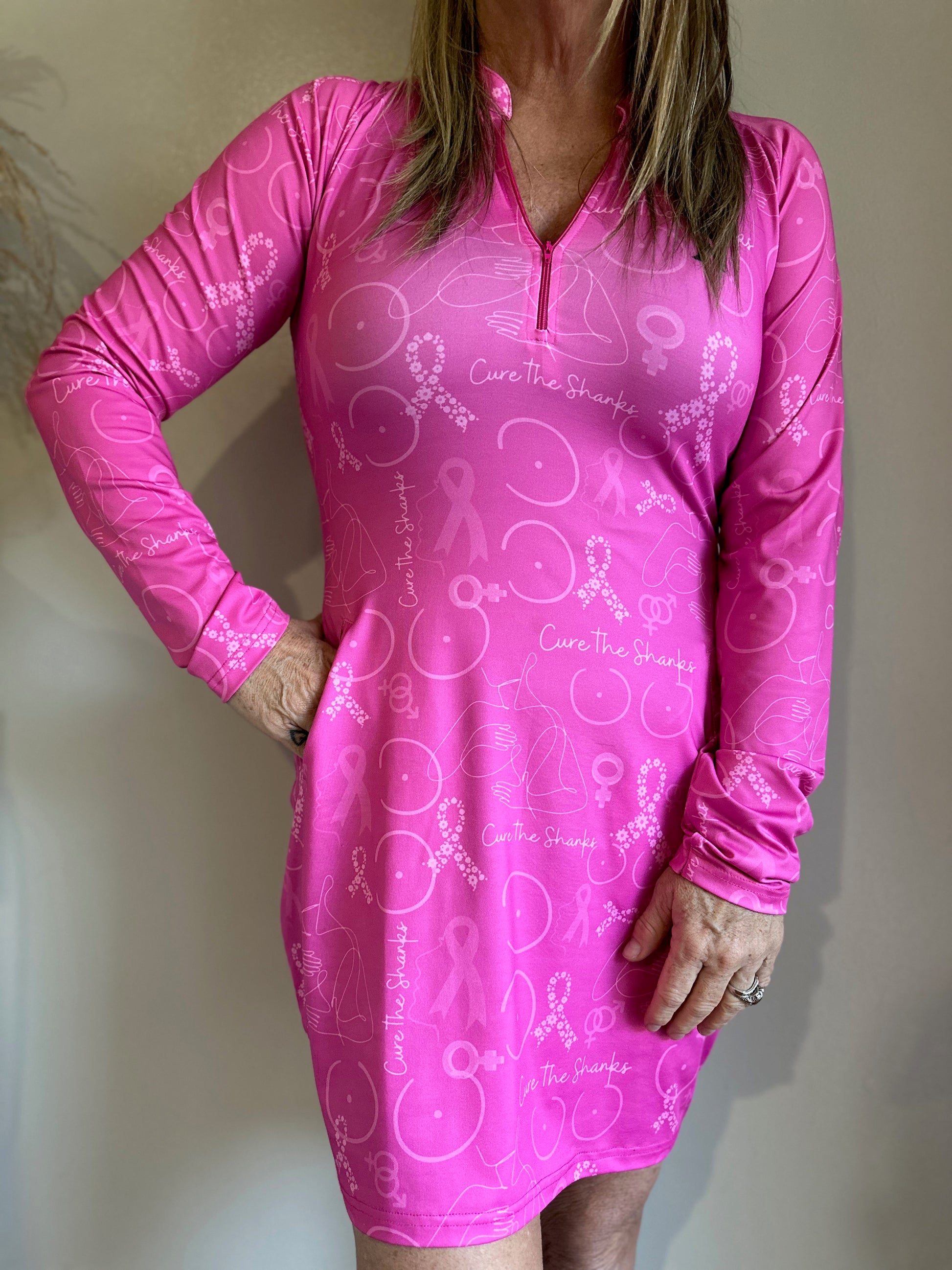 Our latest release for Breast Cancer support - Cure the Shanks Women's Golf Dress! This long sleeve dress is a unique design from co-owner and breast cancer survivor Stacy. It'll keep you covered on the course with 100% Polyester, UPF 50+ protection, and anti-odor, moisture-wicking, wrinkle-resistant, 4-way stretch fabric.