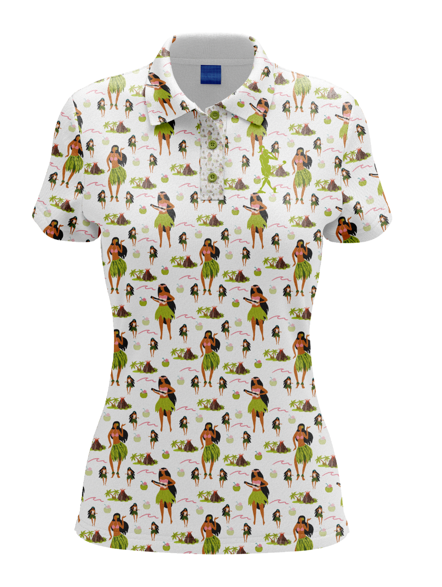A classic but quirky women's golf polo. Featuring a Hawaiian hula girl. Made from a fun blend of 92% Polyester and 8% Spandex, with UPF 50+ protection and anti-odor, moisture-wicking, wrinkle-resistant, and 4-way stretch capabilities.