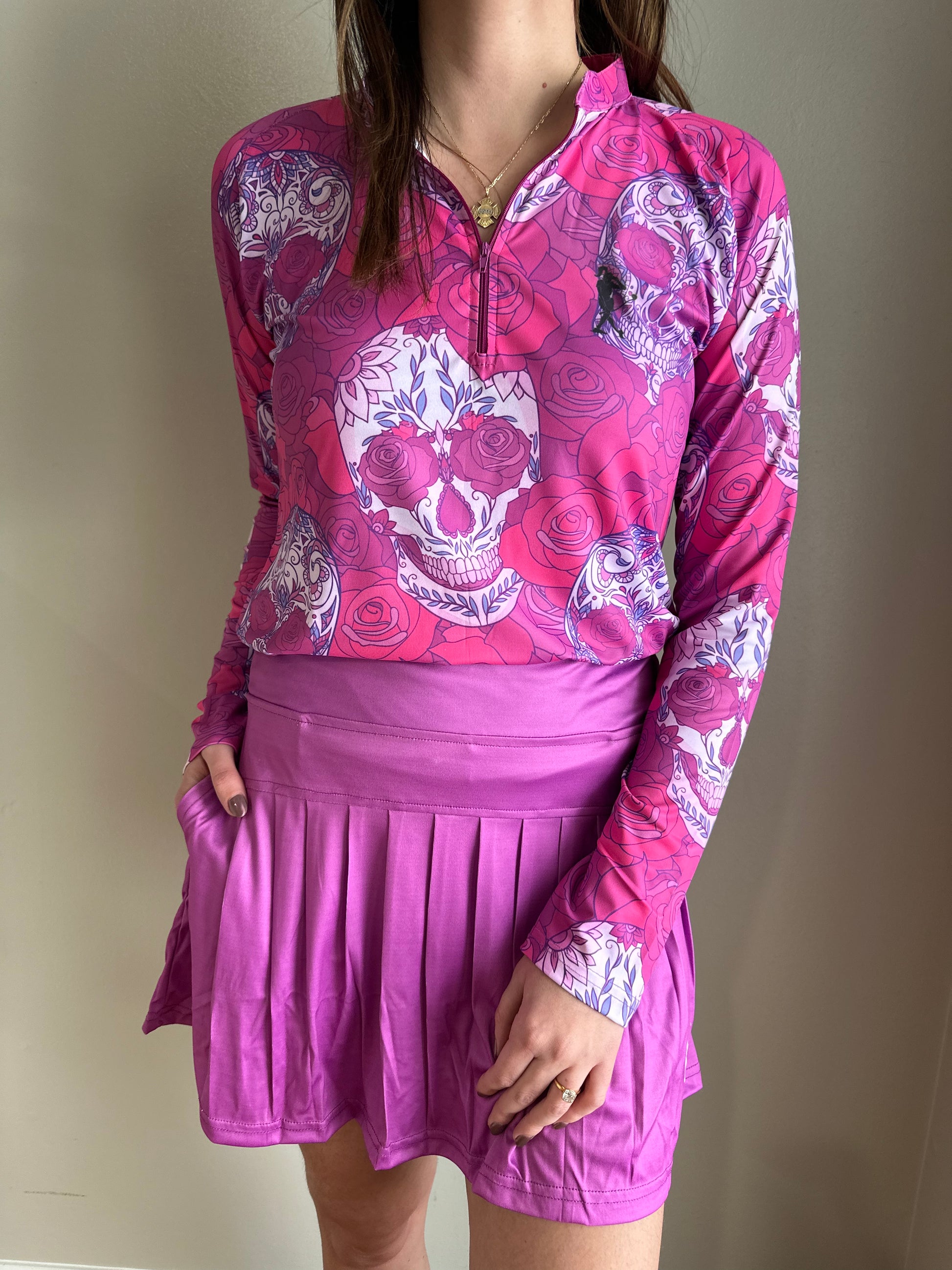 Swing into fun with this ruffled golf skort for women! Perfectly paired with a "Pour Some Sugar On Me" quarter zip. Made of 92% Polyester, 8% Spandex with UPF 50+ protection and features like anti-odor, moisture-wicking, wrinkle resistance, and 4-way stretch.